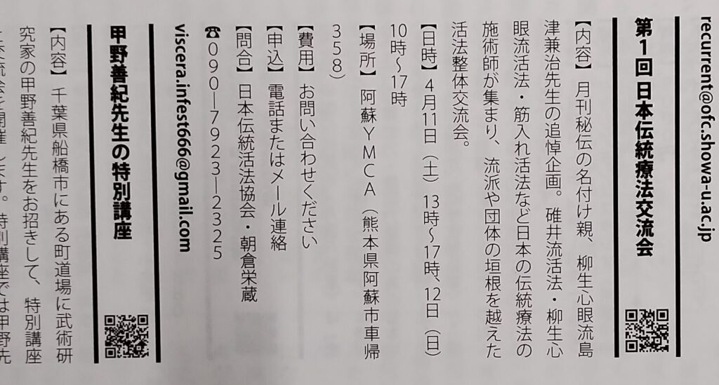 着手すると言えば、私が所属する「日本伝統活法協会」主催による「第1回日本伝統療法交流会」が来月4月11日~12日に阿蘇YMCAで開催されます。